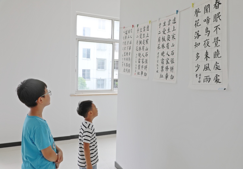 8月28日,在江心沙職工書屋二樓,一場為期一周,象征著收獲的青少年書法展,吸引了不少職工居民和學生前來觀覽。圖為“書迷”們觀摩“暑期公益課堂·書法班”“結業”作品的溫馨場景。