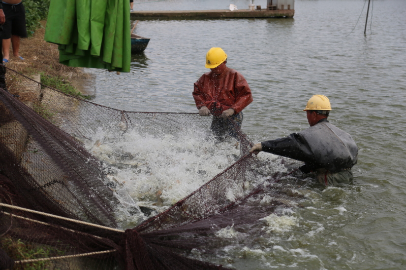 初秋的早晨已然涼意十足,早上不到6點,天剛蒙蒙亮,捕撈人員就來到魚塘開網起魚。在水產公司工作人員的指揮下,一張巨大的漁網隨著捕魚工人的移動緩緩張開,大家不顧冰冷的水下溫度,緊張忙碌了起來。經過鋪底、收網、聚攏等環節的共同協作,漁網被慢慢升起……整個現場一片繁忙熱鬧景象。經過近三個小時的忙碌,在大家的精心分揀下,裝滿魚的筐子被吊車有序吊起,稱重、記錄、放魚一氣呵成。“這個吊車頂部的黃色圓塊就是電子秤,吊起魚的同時,秤上的信號就發到這個無線接收裝置上來,秤重既方便又精準?!爆F場記賬的方正解釋說。