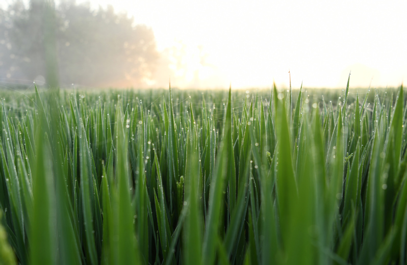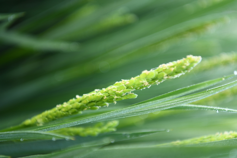 陽光下,霧氣散,空氣中彌漫著清新的稻花香。俯瞰蔥綠的稻田,如一條條綠絲帶整齊排列。晶瑩的晨露凝結(jié)在青翠的秧苗上,猶如給稻田蒙上了一層剔透的面紗。剛抽出的稻穗上,有白色的稻花點點,隨著稻穗一起隨風輕舞飛揚。小蜘蛛也趕來湊個熱鬧,在枝葉上織起了秋的毛衣