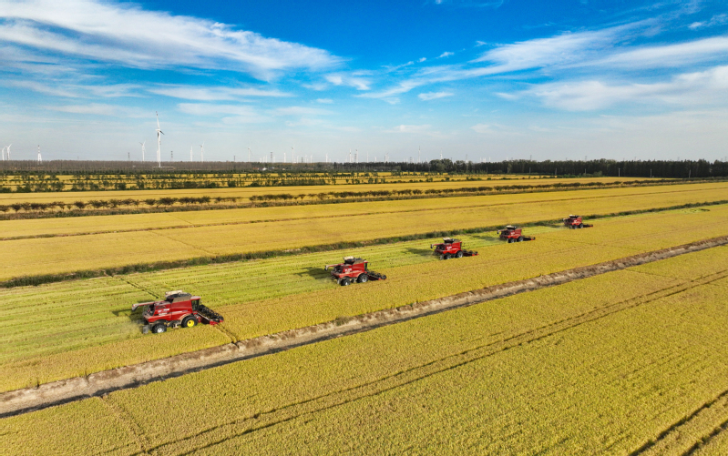 2023年10月28日,在蘇墾農(nóng)發(fā)新洋分公司新南生產(chǎn)區(qū)19大隊(duì)的高標(biāo)準(zhǔn)農(nóng)田上,五臺(tái)凱斯7088大型聯(lián)合收割機(jī)穿梭在稻田中搶收水稻。蘇墾農(nóng)發(fā)新洋分公司搶抓晴好天氣,發(fā)揮農(nóng)墾企業(yè)機(jī)械化優(yōu)勢(shì),確保秋糧顆粒歸倉(cāng)。