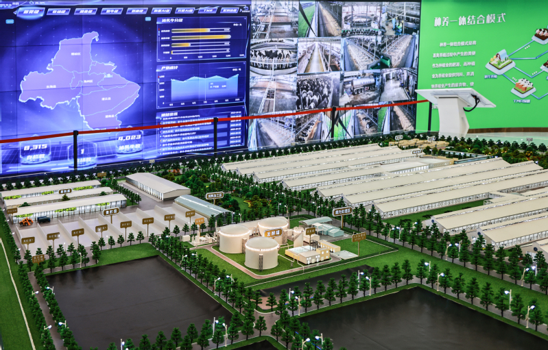 生態化發展加速轉型。牧場智慧生態系統中,污水循環管理設備包含牧場污水管路3D圖與污水監測點位信息,做到實時監測牧場污水指標,并將數據同步上傳至環保局,確保牧場水質監管到位。沼氣發電系統將標準化工藝處理糞污產生的沼氣,用于發電后接入國家電網,沼液利用后的沼渣作為奶牛牛床墊料的生產原料,不僅成本低,更大大降低了養殖風險。同時在場區配備廢氣檢測設備監測養殖氣體環境,配備消防監控設備監測飼草區與沼氣發電區域煙火狀況。智能生態系統采取糞污固體發酵、沼氣烘干回床、沼液還田方式,實現“變廢為寶”。對牧場糞污發酵后的液位進行采集,經過無害化處理后的沼液通過預設專用管道,在卷盤式噴灌機的運轉下自動噴灑在專屬消納用地的田間作物上,形成種養一體循環,有效提高了糞污綜合利用水平。