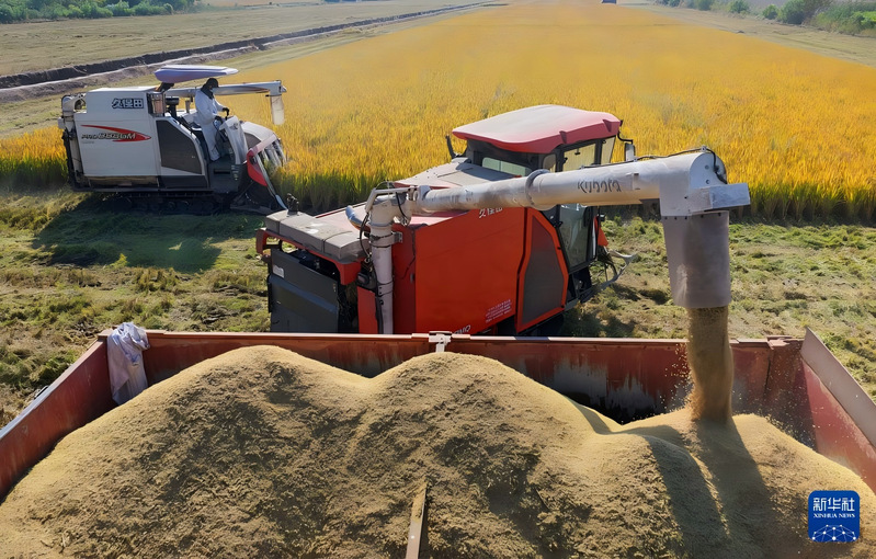 11月5日,江蘇省農墾農業(yè)發(fā)展股份有限公司南通分公司收割機卸運剛剛收割的水稻(無人機照片)。