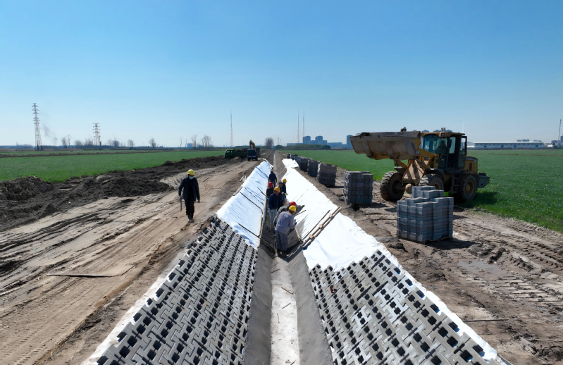 3月19日,在南通公司二大隊,土地綜合整治工作正如火如荼進行,施工團隊正在為排水溝鋪設生態磚。為更好適應集中連片、智慧化生產需要,南通公司從去年起推動補充耕地土地綜合整治,項目投資1700余萬元,建設規模332.9公頃,預計可新增耕地15.4公頃,截至目前總體形象進度完成近30%。