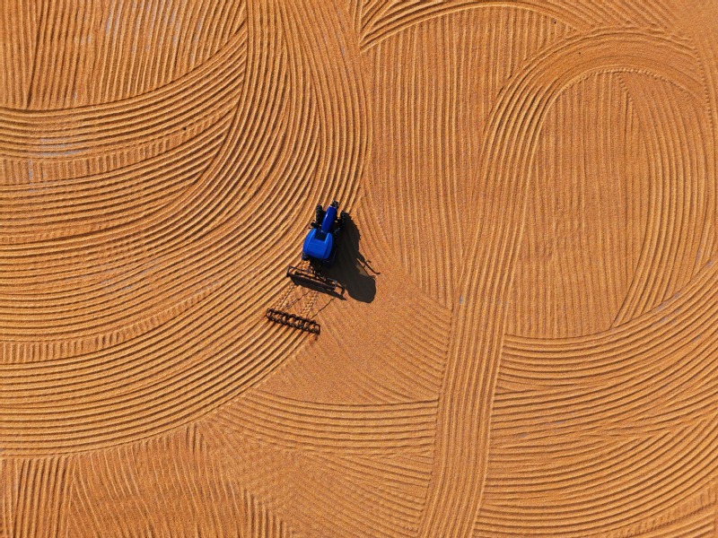 隨著天氣轉好,崗埠農場加緊推進秋糧收獲、晾曬等工作。圖為10月22日,崗埠農場職工駕駛翻糧機械,利用晴好天氣晾曬玉米。在藍天白云的映照下,翻糧機在金色的玉米上劃出一道道優美的弧線,刻畫出秋日的美好“豐”景。