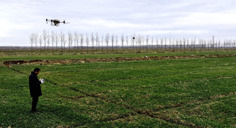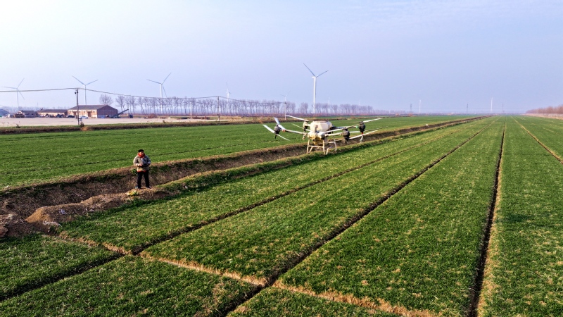 眼下正是小麥越冬管理的關鍵時期,針對近期明顯降雨,黃海統一部署,以促進小麥增根返青分蘗穩長、壯苗長勢持續穩健、增加穗粒數為主要管理方向,分類管理,根據小麥的生長情況和土壤養分狀況,選擇合適的肥料,利用無人機有序開展施肥作業,增加早春分蘗,補足總莖數。下一步,黃海將進一步抓好大小麥化除、清溝理墑等田間管理工作,推進各項農業措施落實落地落細,全力以赴奪取夏糧豐收。圖為十二生產區管理人員針對局部弱黃苗補肥,操作無人機進行捉黃塘作業,保障大小麥安全越冬。
