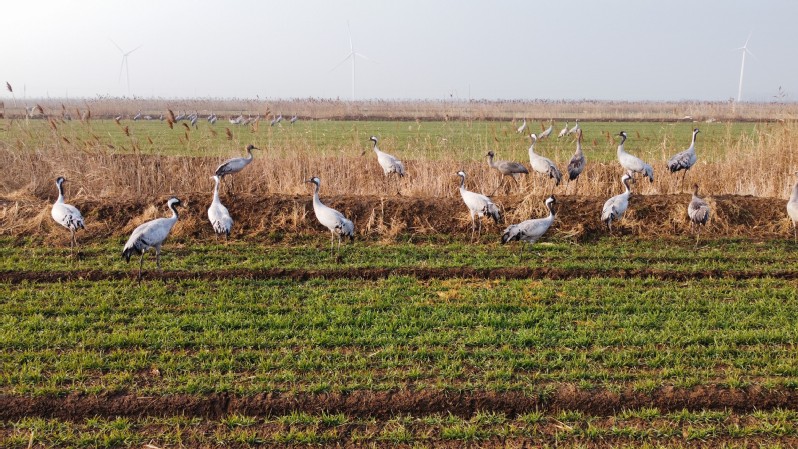 “快看,好多大鳥!”1月12日上午,在淮海農場七分場社區墾三隊的麥田里,分場技術員王凌云在用無人機巡田時,突然發現了成群的灰鶴及幾只稀有丹頂鶴在此棲息。為留下這些珍稀鳥類的影像資料,他連忙用無人機對準拍攝,記錄下這些鳥兒在這里駐足的珍貴鏡頭,這也是淮海農場首次看到如此多的珍稀鳥類群體聚集在此越冬。七分場是淮海農場最東端的一個分場,毗鄰國家丹頂鶴自然保護區,占地1萬多畝,與黃海一堤之隔,海岸線南北長達近5公里。堤外濁浪滾滾,堤內綠意濃濃,少人的管理,靜謐的環境,綠色的麥苗,搖動的風車和黃色的枯草,讓這里的生態風景如畫。近百只灰鶴和丹頂鶴組成的“團隊”落腳農場麥地,它們或追逐嬉戲,或駐立棲息,或低頭覓食,在無人機的視角下,盡顯生態之美、和諧之美、發展之美。“我是在墾三隊麥田里看見它們,當時離它們差不多200米左右,但是距離太遠不能完全確定,后來請我們生產區珍禽巡護員梁永河與珍禽保護區專家聯系辨認,才確定是國家一級保護動物丹頂鶴和國家二級保護動物灰鶴。”王凌云說,當時農渠里飄起毛茸茸的蘆花,襯得麥苗綠油油,綠黃交界處,立著一群雪白身影,丹頂鶴和灰鶴悠然踱步其間,自成風景,讓我倆甚是贊嘆。多年