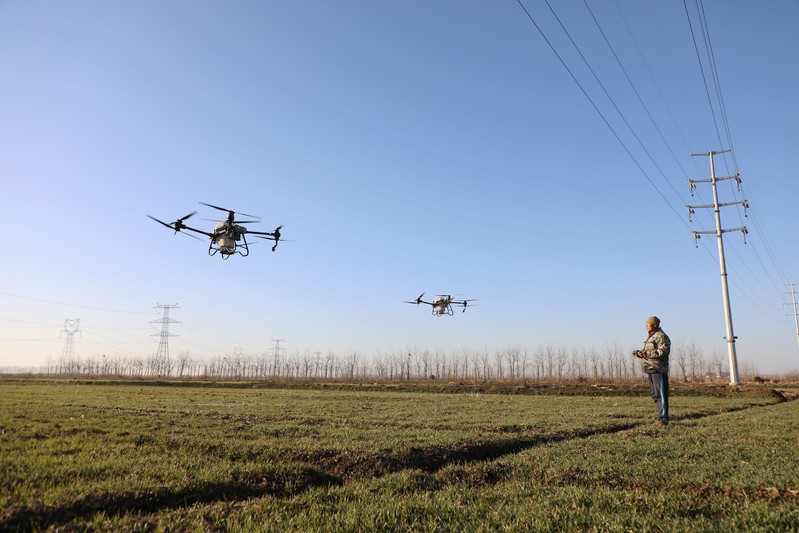 當前,冬小麥田間管理進入關鍵期,走進東洋生產區67大隊小麥田,遠遠望去,一行行一列列郁郁蔥蔥的麥苗隨風搖曳,麥田上空不時有噴灑肥料的無人機輕輕掠過,農業大隊長蔡祥正在田間帶領技術員一起查看苗情,指導工人們使用無人機給麥苗進行追肥,助力冬小麥豐產豐收。
