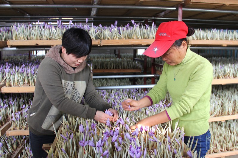 2023年11月9日,弶港農場西紅花種植戶們正采收花絲。西紅花又稱藏紅花,是高檔中藥材,該場通過開展“情系紅花、富民強農”創業致富工程活動,60多戶西紅花合作社成員畝收益達1-3萬元。當前正值西紅花收獲季節,種植戶們喜摘“致富花”。