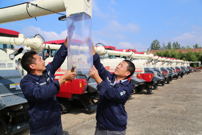 “小朱,這根皮帶松了,咱們一起給調一下,要不然到時候容易脫落,耽誤收割。”9月20日,在蘇墾農發崗埠分公司農機總站,農機檢修人員羅軍正和朱玉保兩位同志一起,給大豆收割機進行檢修維護。在現場,21臺大豆收割機洗刷一新,整齊排列著,顯得氣勢非凡。為了備戰即將到來的“三秋”,連日來,農機總站積極組織人員對各類機械進行維修保養。“針對大豆收割機輸糧器容易堵塞的問題,我們請廠家到現場進行了檢查,并根據建議進行了改造。同時,對機油、線路、水箱等進行了詳細檢查,確保機器運行正常。”農機總站站長張猛表示。不遠處,兩名工人正在給農機更換輪轂。“這類農機之前是用來在玉米大豆地里中耕、化除和去雄作業的,使用的是窄輪胎,現在更換寬一點的輪胎,方便農機在場頭翻曬糧食和麥田開溝。”工人們說道。崗埠分公司農機總站高度重視農機農具檢修保養工作,自三夏大忙結束,農機總站立即開展維修保養工作,多次組織農機廠家技術員、農機作業組及維修保養專業人員,對農機總站的收割機、播種機、撒肥機、開溝機等進行了全面檢修保養和調試,確保各式農機器械“三秋”拉得出、打得響、干得棒。“除了常規保養檢修機械,我們還進一步加強農機社會化服務工作,