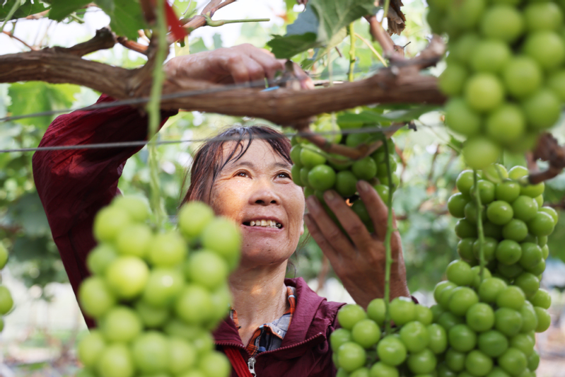 云臺(tái)農(nóng)場(chǎng)公司依托良好區(qū)域生態(tài)優(yōu)勢(shì),積極發(fā)展生態(tài)休閑農(nóng)業(yè),促進(jìn)農(nóng)旅融合發(fā)展。圖為8月19日,職工在云水灣濕地公園采摘葡萄。據(jù)悉,該場(chǎng)栽植鋼架大棚葡萄55畝,畝產(chǎn)最高達(dá)2700斤。