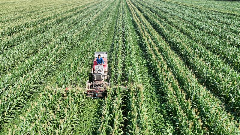 蘇墾農(nóng)發(fā)抓好12萬(wàn)畝玉米大豆帶狀復(fù)合種植精細(xì)化管理,在去年成功試驗(yàn)的基礎(chǔ)上,組織農(nóng)機(jī)對(duì)玉米進(jìn)行去頂,既降低植株高度,減少倒伏風(fēng)險(xiǎn),又增加了玉米大豆受光面積,促進(jìn)產(chǎn)量提高。圖為農(nóng)機(jī)在蘇墾農(nóng)發(fā)東辛分公司玉米大豆田間進(jìn)行玉米去頂作業(yè)。
