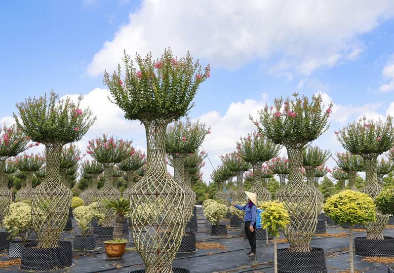 在新洋農場容器苗項目基地,工作人員冒著高溫,穿梭在整齊排列的容器苗間,細致開展噴施營養液、修剪等苗圃管護作業,為苗木生長保駕護航。