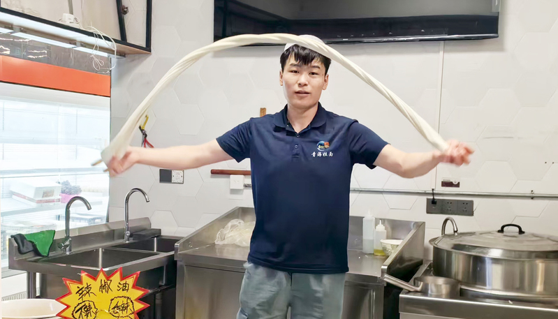為支持青海拉面“四進”活動開展,中山精品酒店在1樓嘉年華超市單獨開辟一處給青海河湟拉面產業運營有限公司制作銷售拉面,實行0租金使用。圖為工作人員在制作拉面場景。