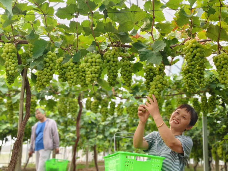 “海農(nóng)葡萄”引八方葡友前來采摘、觀賞。圖為一位顧客雙手輕托飽滿青綠的葡萄串,仰頭注視,在綠葉與累累果實(shí)環(huán)繞間,盡顯田園采摘的愜意與對(duì)果實(shí)的欣賞。