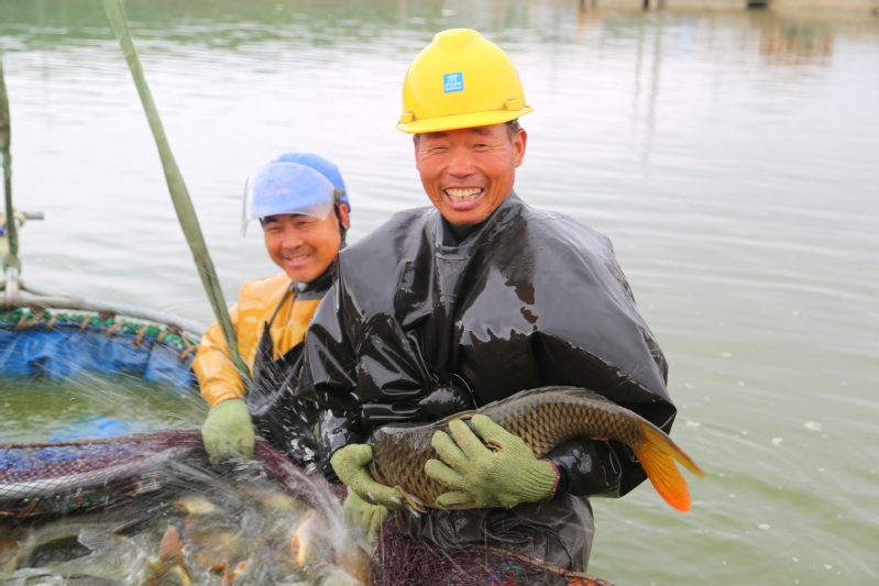 正值淡水魚出塘上市季節(jié),崗埠農(nóng)場(chǎng)南漁場(chǎng),大型吊車正在起網(wǎng)捕撈鯉魚,一幅人歡魚躍的水上夏收景象。圖為漁民展示捕撈的大鯉魚。